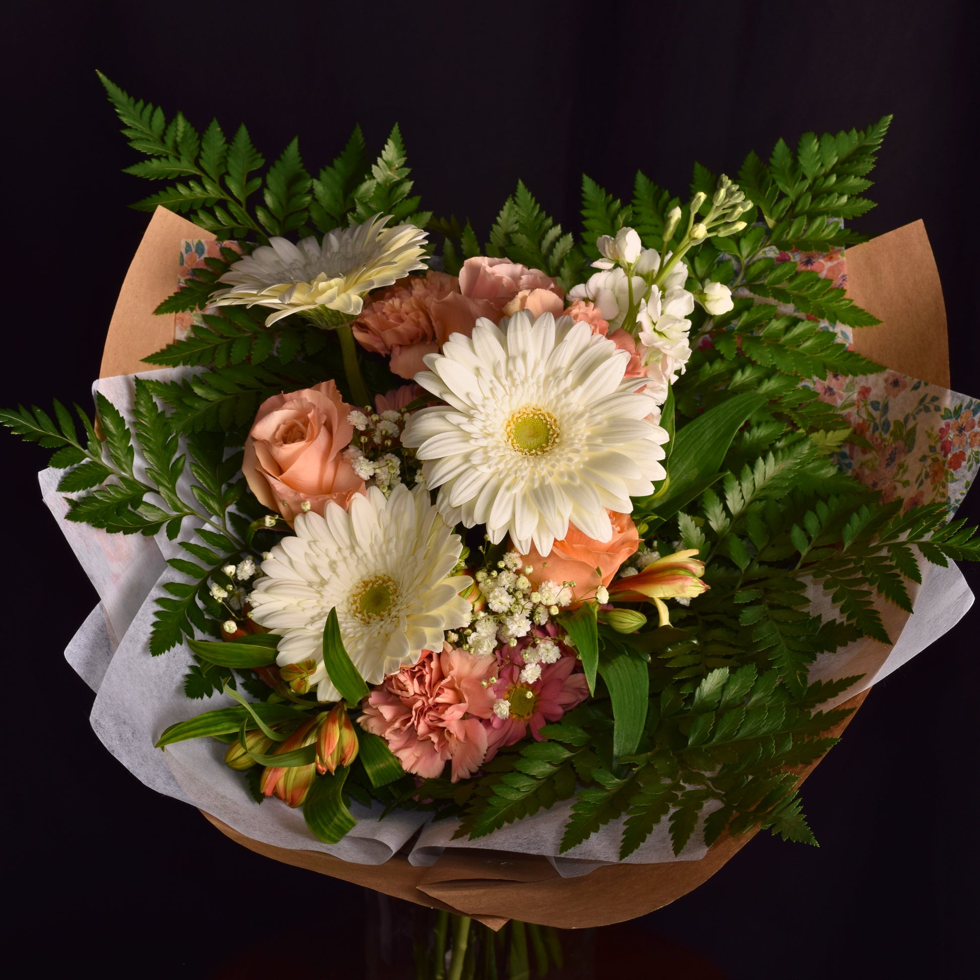 Our Hand-Tied Bouquets are individually curated for each customer using fresh seasonal blooms and lush greenery. This design option is ideal if you know you have plenty of vases at home and don't need to add to your collection. Each of our bouquets is wrapped for easy transport.